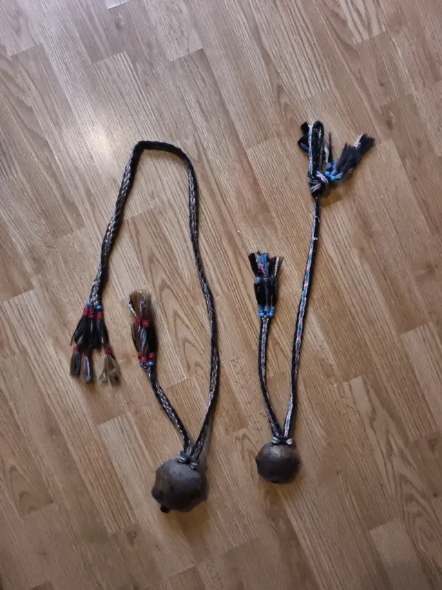 Dettagli del prodottoDue campane decorative con un design unico. - Corda intrecciata in tonalità scure e multicolori. - Decorazioni con frange e perline nella parte superiore. - Base in metallo con finitura rustica. La descrizione è stata tradotta automaticamente.