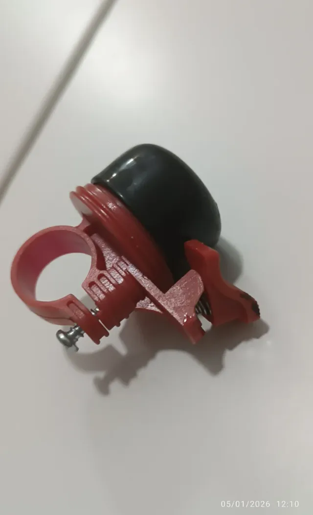 Campanello per bicicletta di colore rosso. Facile da montare sul manubrio. - Materiale plastico resistente. - Meccanismo a leva.