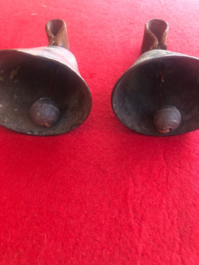 Campanelle in bronzo di duecento anni che suonano perfettamente con la loro patina originale. I diametri sono 7,5 cm e 6,5 cm e le altezze 9 e 8 cm senza contare le cinghie.