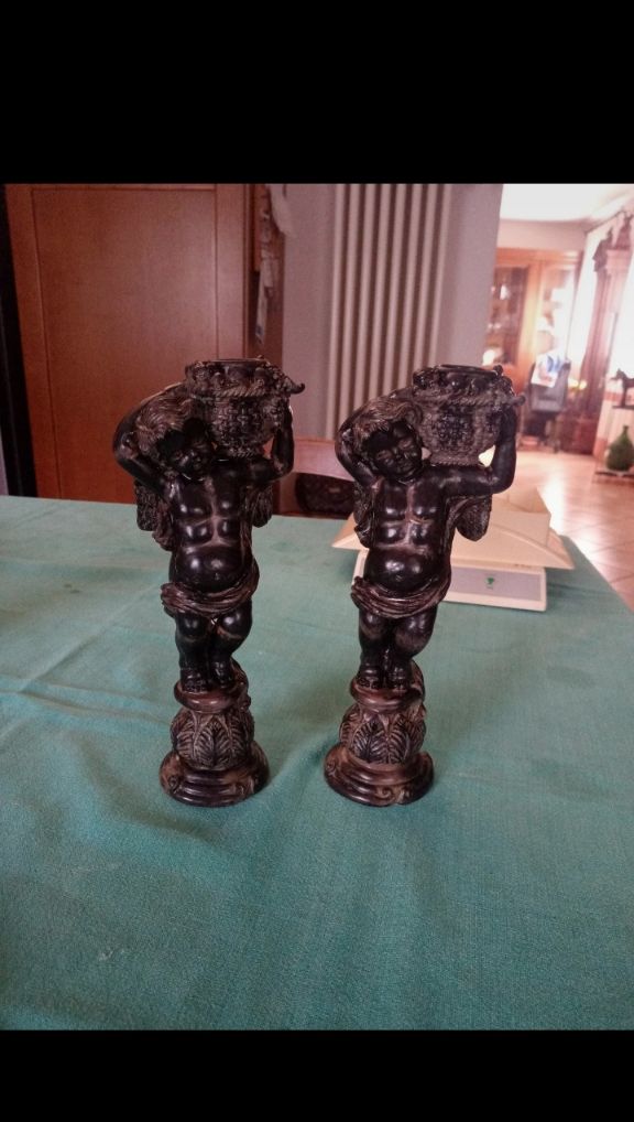 2 portacandele raffiguranti dei putti su una colonnina che sorreggono una cesta di frutta. In resina. Peso complessivo kg 0,850.