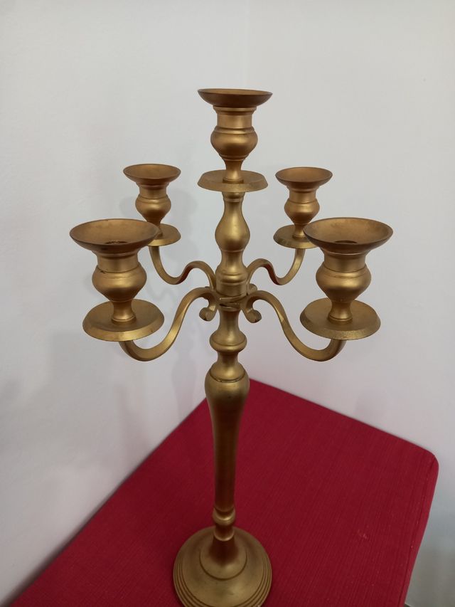 candelabro in colore oro, porta candele cinque,candela piccola 2cm e candela grande 7,50 cm