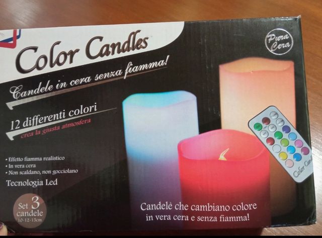 Dettagli del prodottoCandele in pura cera (non si consumano e non gocciolano) che cambiano 12 differenti colori con telecomando (ancora integro; per accenderle ho usato il mio); funzionano con 3 batterie 1,5v (non comprese) per ogni candela 🕯️. Nuove senza cartellino (solo la scatola è leggermente rovinata sopra)