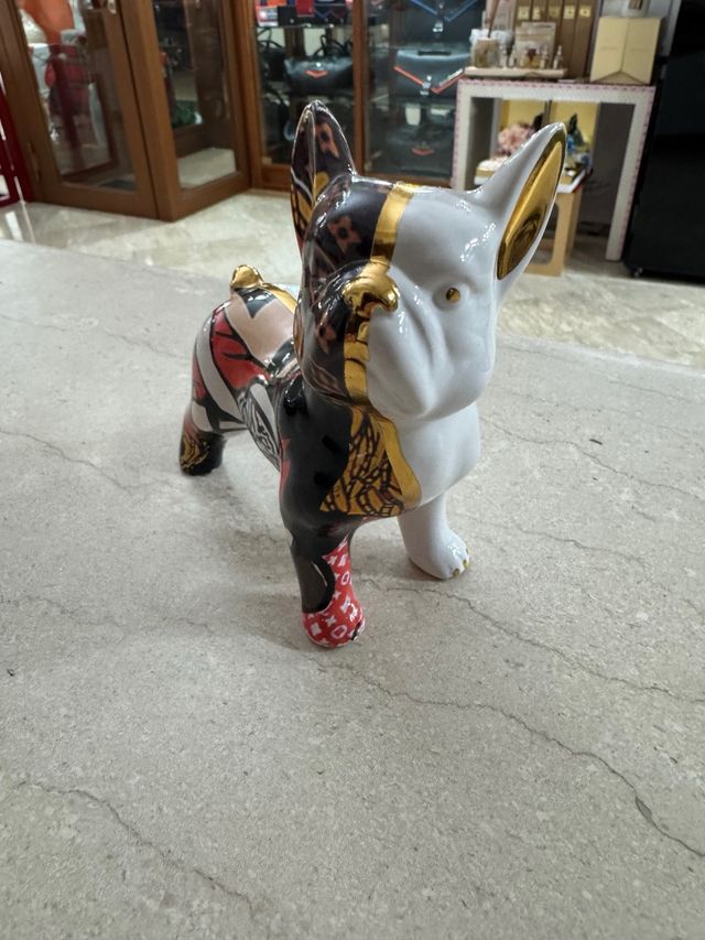 Statua di un cane in porcellana, con un design unico e colorato. - Decorazioni a contrasto. - Dettagli in oro.