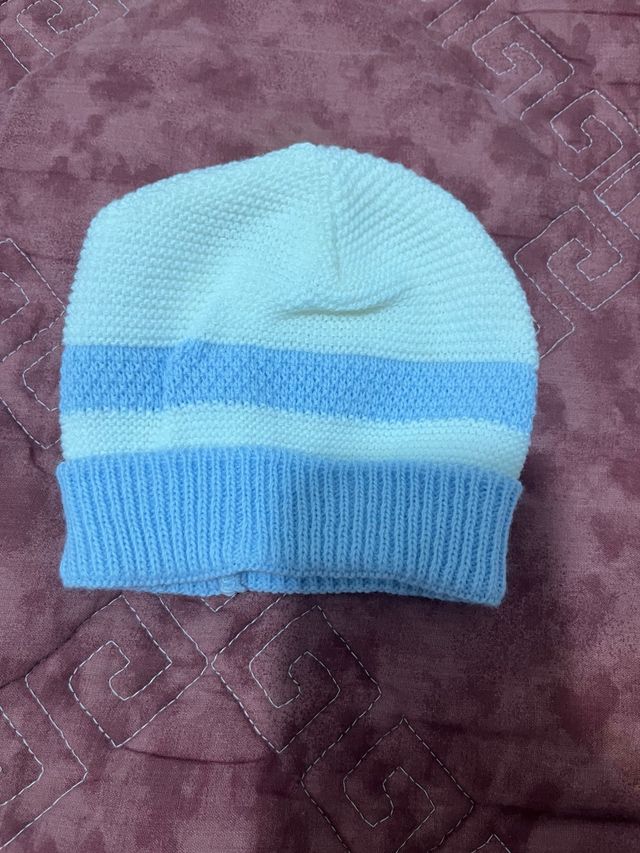 Morbido cappellino per neonato, perfetto per tenere al caldo la testa. - Colore bianco con dettagli azzurri. - Fascia e dettagli a contrasto. - Tessuto a maglia.