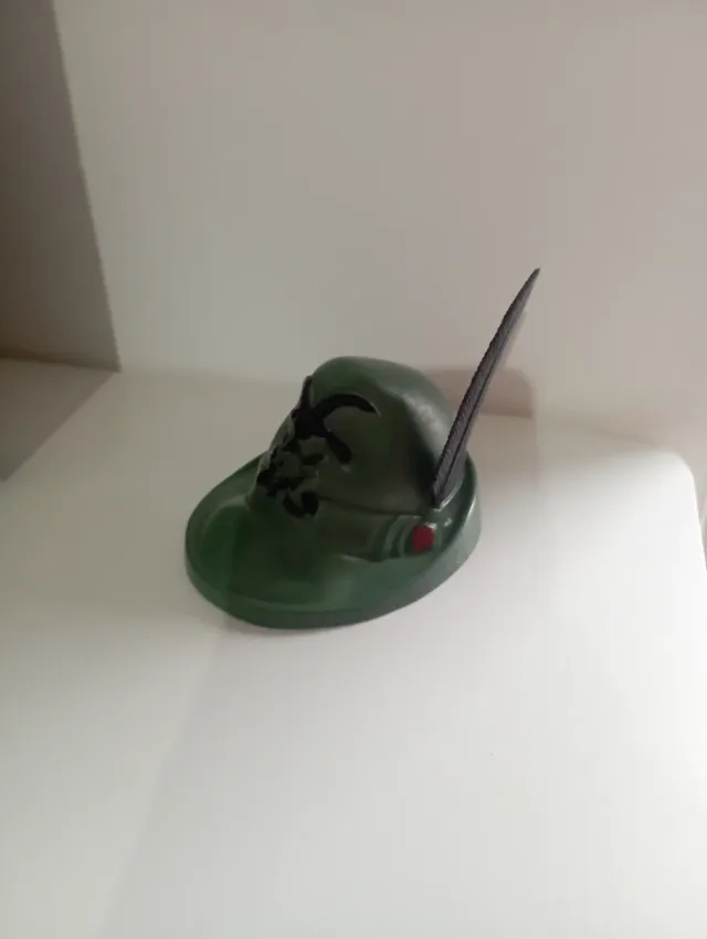 Cappello da Alpino in metallo di colore verde, un accessorio iconico anni '70 - Decorazione con piuma nera. - Dettaglio rosso sul lato.