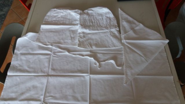 Vendo 2 cappelli da chef bianchi 1 tovagliolo o canovaccio che va al collo 1 grembiule misure: 84cm di lunghezza x 56 di altezza Usati