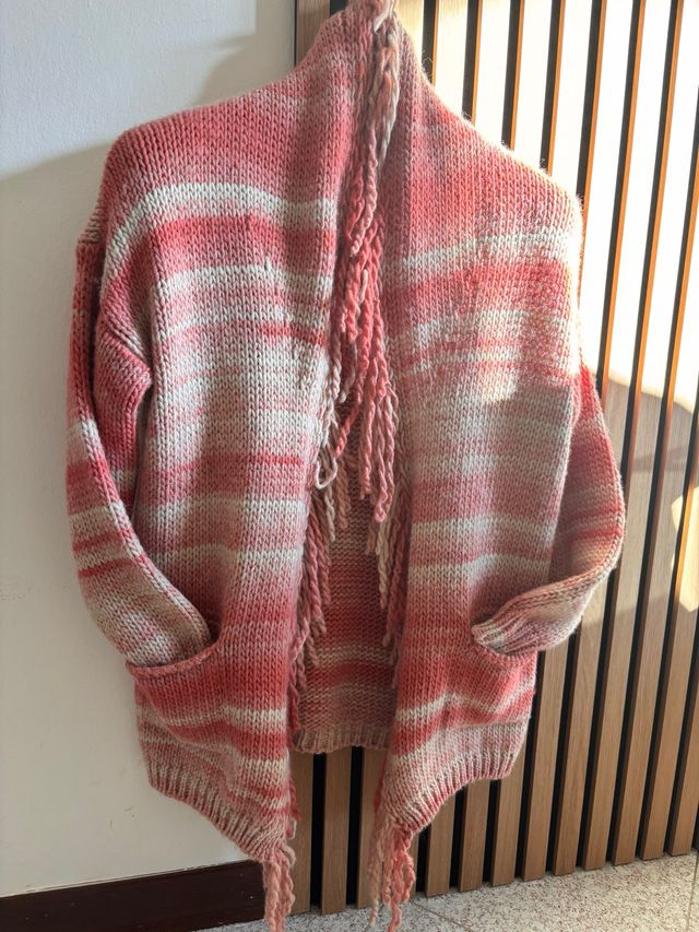 Dettagli del prodottoBellissimo cappotto lavorato a maglia per bambina, in sfumature di rosa e crema.