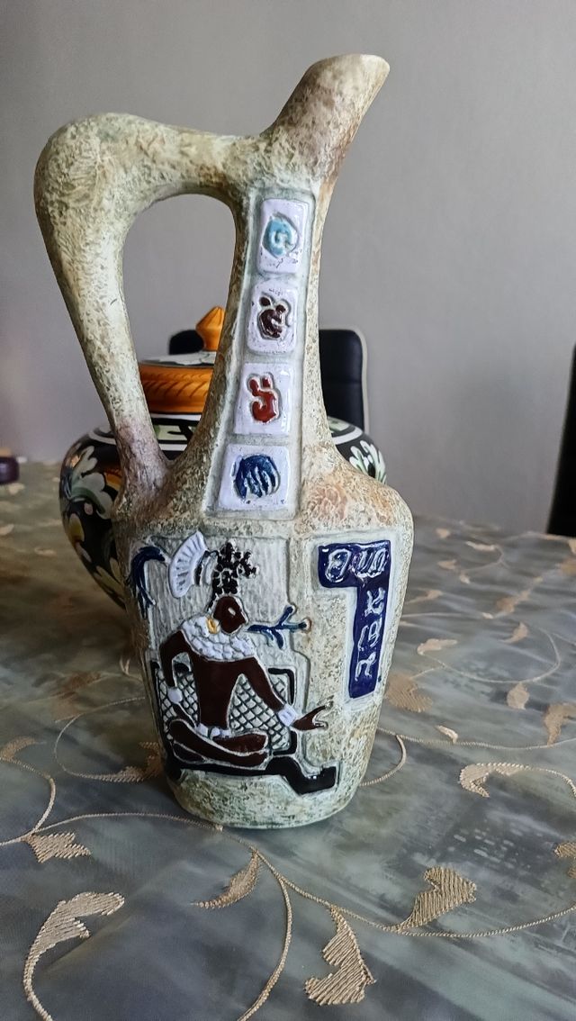 Dettagli del prodottoCaraffa in ceramica decorata, risalente agli anni '60 o '70. Presenta un design unico con figure stilizzate e decorazioni a rilievo.