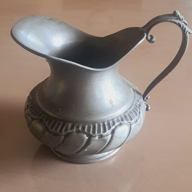 Dettagli del prodottoElegante caraffa vintage realizzata in peltro. Il design presenta un manico decorato e un corpo bombato con dettagli a rilievo.