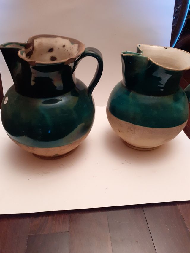 Brocche in ceramica smaltata in verde ramina,h 19,5,sbeccature visibili
