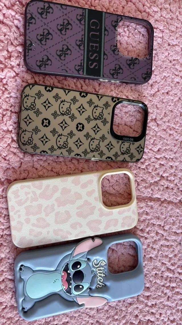 Dettagli del prodottoSet di 4 cover per iPhone 14 Pro. - Cover viola con logo Guess. - Cover beige con stampa di Hello Kitty e LV. - Cover rosa con stampa leopardata. - Cover blu con personaggio di Stitch. La descrizione è stata tradotta automaticamente.