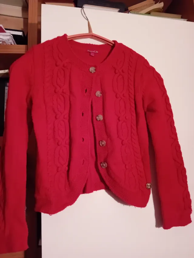 Cardigan rosso per bambina, perfetto per completare ogni outfit. - Design con trecce decorative. - Chiusura con bottoni. - Scollo rotondo.