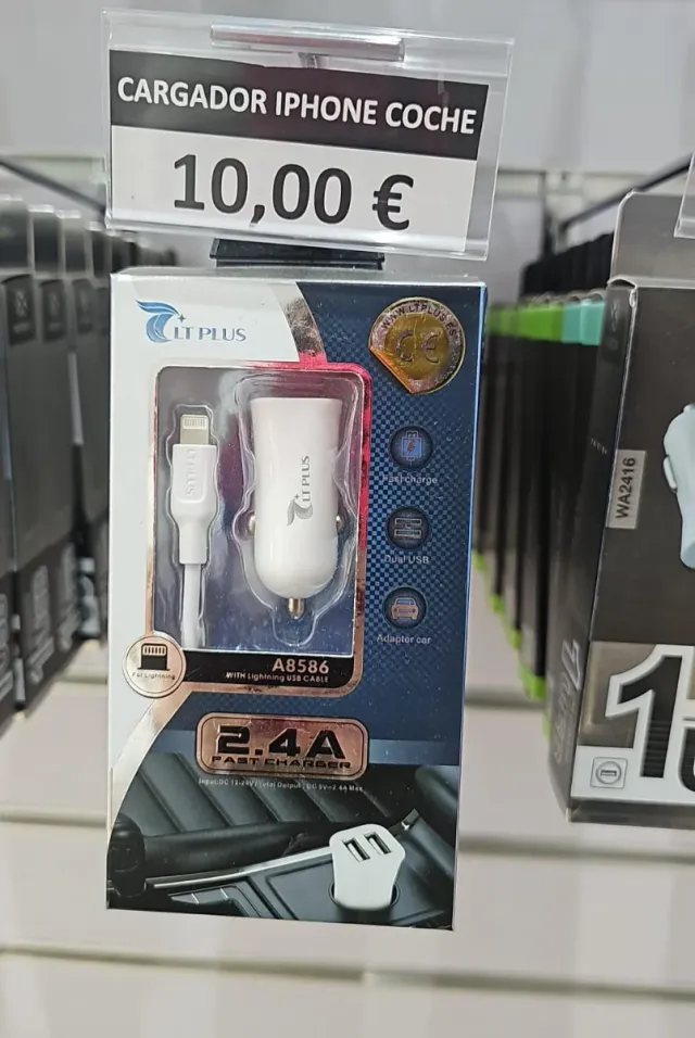 Dettagli del prodottoCaricatore per auto LT PLUS con cavo Lightning per iPhone. - Doppia porta USB. - Ricarica rapida 2.4A. - Include cavo USB a Lightning. La descrizione è stata tradotta automaticamente.