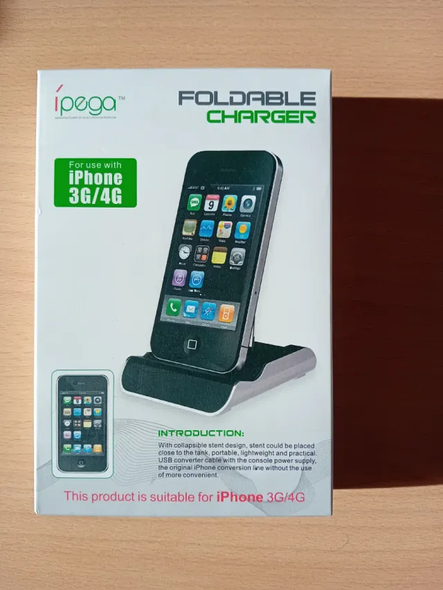 Dettagli del prodottoCaricabatteria da tavolo pieghevole per iPhone 3G/4G. Design pieghevole e compatto. Ideale per posizionare l'iPhone sulla scrivania. Include cavo di conversione USB. La descrizione è stata tradotta automaticamente.