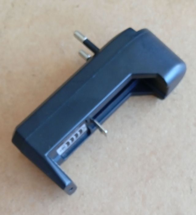 Dettagli del prodottoCaricabatterie intelligente Jia-Xin per batterie formato 18650, con spina retrattile, input AC100-220V, output 3.7V/450mA.
