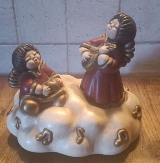 Dettagli del prodottoBellissimo carillon Thun raffigurante due angioletti, uno con un cuore e l'altro con una chitarra, su una nuvola con note musicali. I colori sono tenui e delicati.