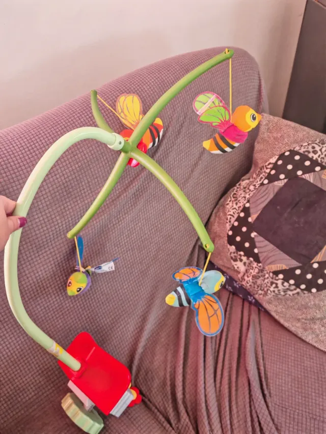 Dettagli del prodottoCarillon da culla con simpatiche api colorate. La struttura è verde chiaro e si aggancia facilmente al lettino.