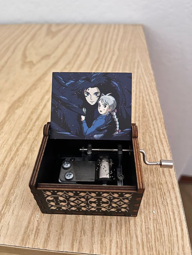Carillon in legno con decorazioni intagliate e un'immagine ispirata a Il Castello Errante di Howl.