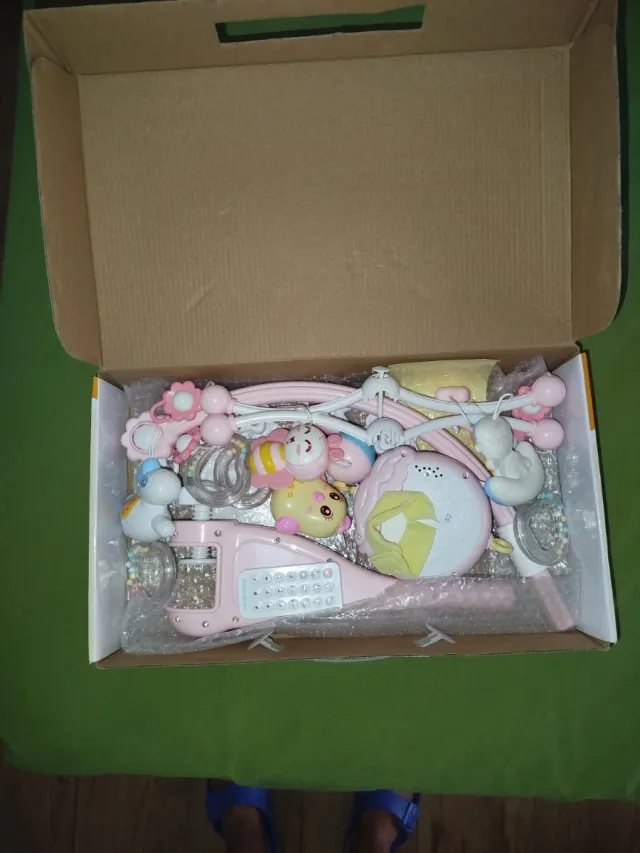 Carillonetto rosa per culla, ideale per intrattenere i più piccoli. - Struttura in plastica rosa. - Decorazioni a forma di fiore e animali. - Include telecomando.