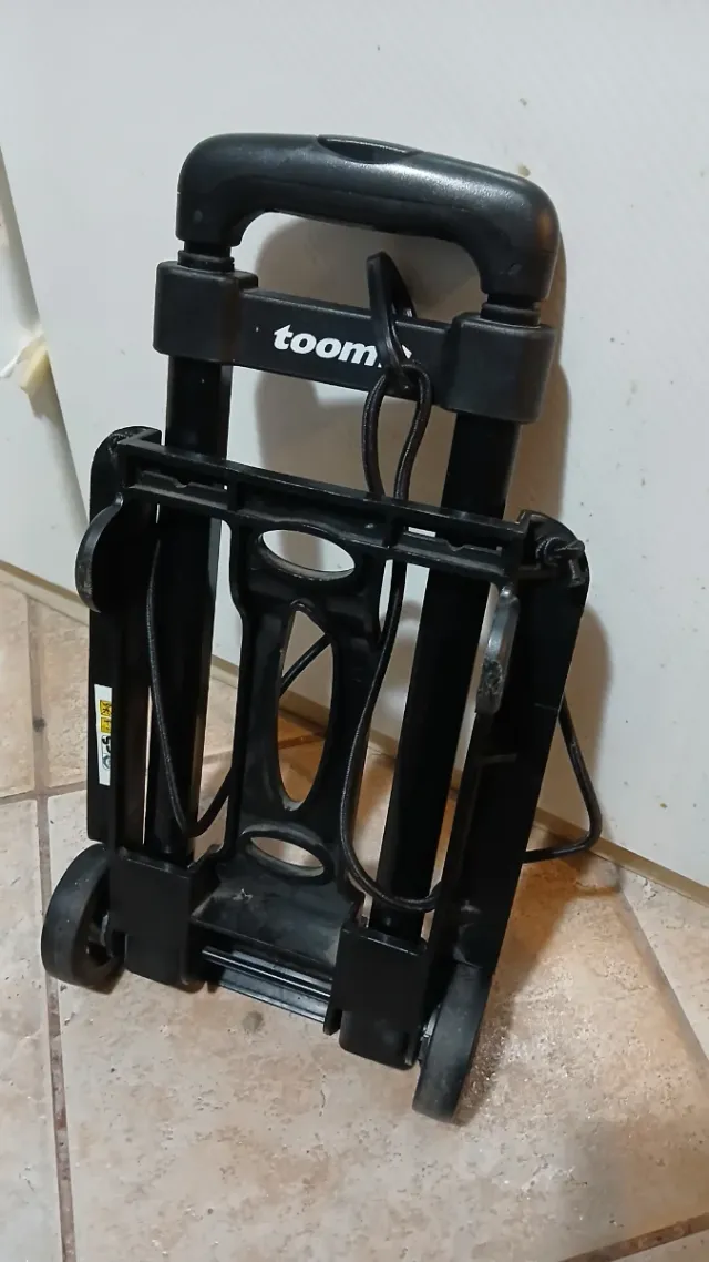 Carrellino portabagagli Toom, pratico e pieghevole. - Struttura in metallo nero. - Manico telescopico. - Due ruote per facilitare il trasporto.