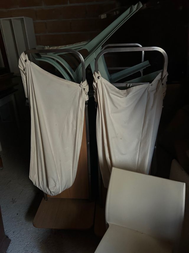 Carrello porta biancheria con struttura in metallo e sacche in tessuto. - Struttura in metallo. - Sacche in tessuto color crema. - Base in legno.