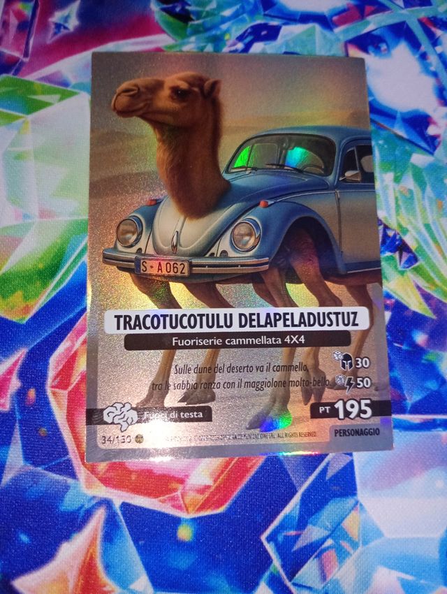 Carta del gioco Brainrot, raffigurante TracotUcotulu Delapeladustuz. - Fuoriserie cammellata 4x4. - Numero carta: 34/150. - Punti: 195.