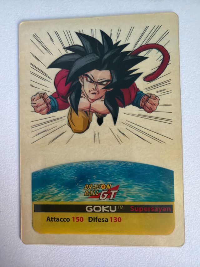 Carta da collezione di Dragon Ball GT. - Personaggio: Goku - Trasformazione: Super Saiyan 4 - Attacco: 150 - Difesa: 130