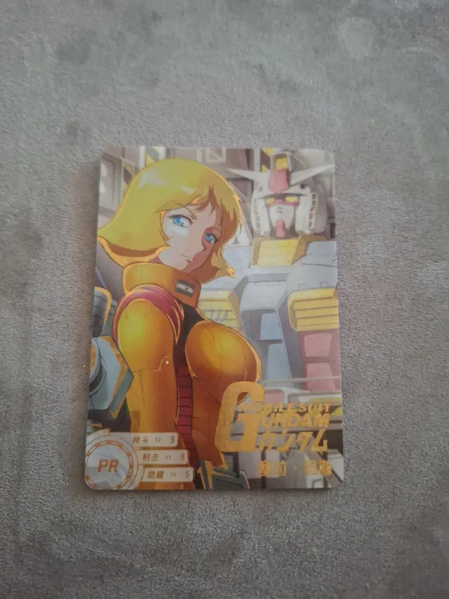 Carta da collezione a tema Gundam. - Personaggio femminile con armatura. - Mecha Gundam sullo sfondo. - Sigla PR in basso a sinistra.
