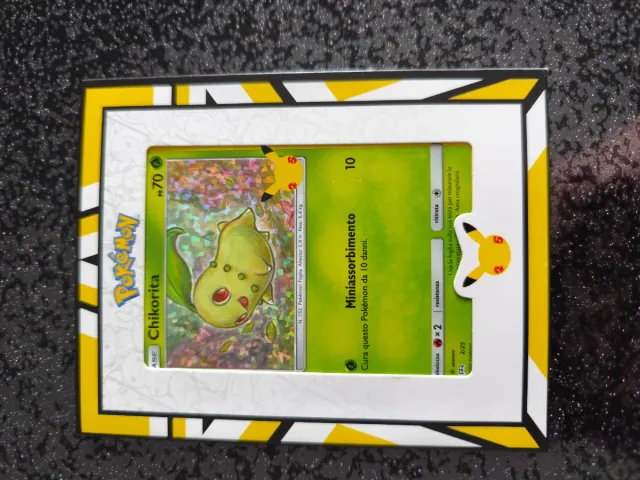 Carta Pokémon di Chikorita - Carta Miniassorbimento che cura 10 danni. - Attacco Miniassorbimento con danno 10. - Debolezza x2. - Resistenza. - Ritirata.