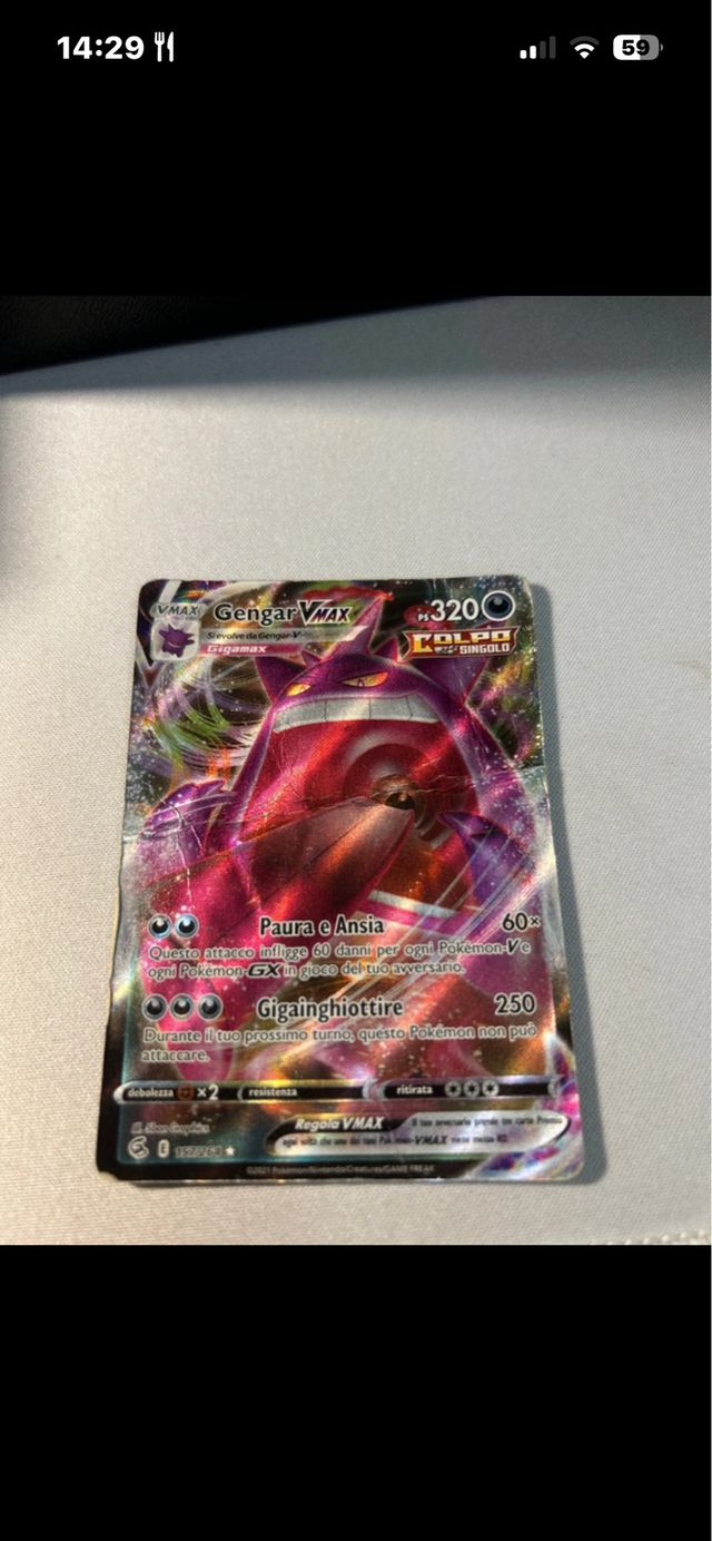 Carta Pokémon Gengar VMAX. - Presenta una piega visibile sulla carta. - Condizioni come da foto.