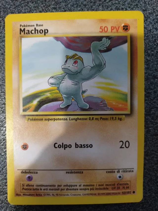Carta Pokémon Base di Machop. - PV: 50 - Attacco: Colpo basso - Costo di ritirata: 20 - Illustratore: Mitsuhiro Arita