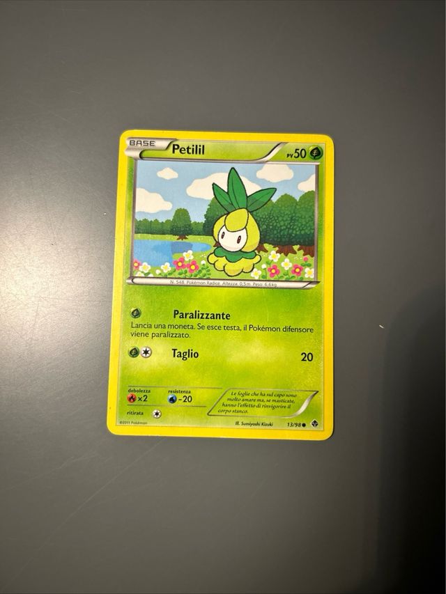 Carta Pokémon di Petilil, numero 13/98. - Tipo: Base - PV: 50 - Attacco: Paralizzante - Attacco: Taglio - Debolezza: x2 - Resistenza: -20