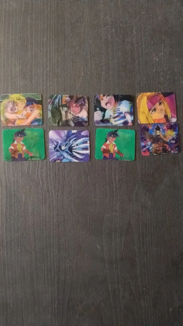 Set di 8 carte collezionabili a tema Beyblade minicard - Illustrazioni colorate di personaggi e creature. - Formato quadrato.