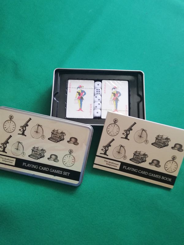 Dettagli del prodottoconfezione di carte da gioco contenente carte e dadi nuovi sigillati. E' incluso un libretto con spiegazione di vari giochi (in inglese). La confezione esterna in latta è un pò rovinata