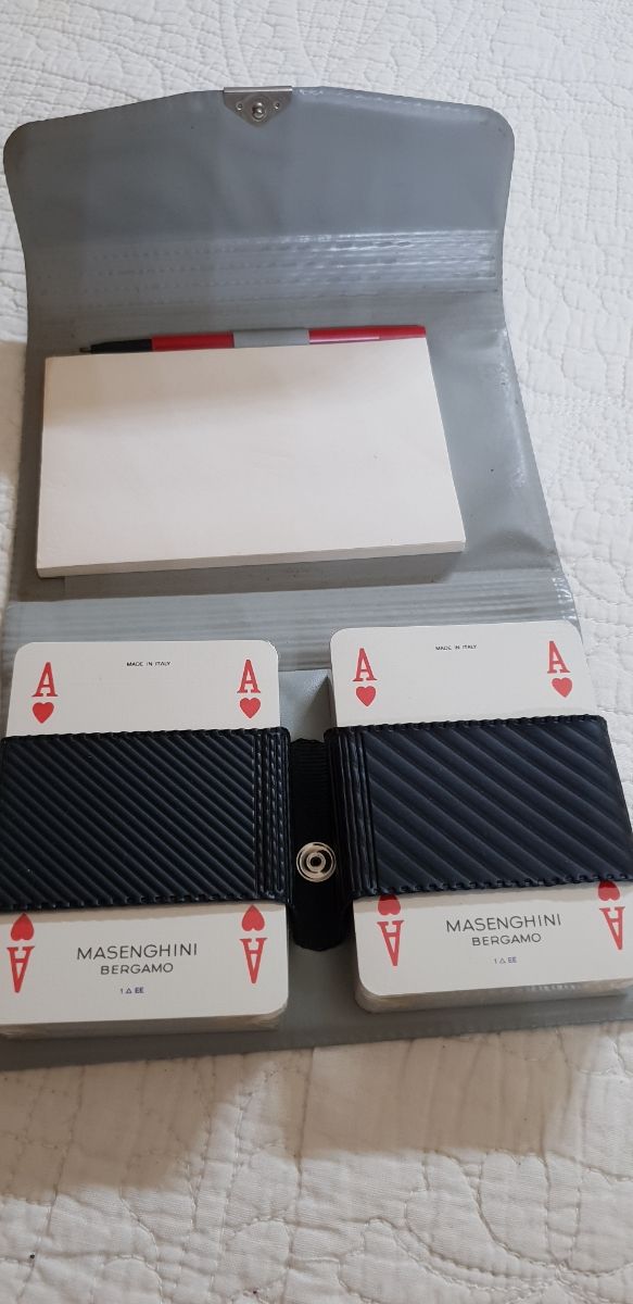 Dettagli del prodottoSet 2 mazzi carte da gioco con custodia, penna e blocchetto segnapunti . nuovo mai usato