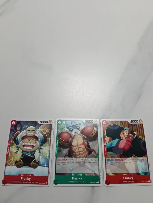 Dettagli del prodottoSet di 3 carte del personaggio Franky dal gioco di carte collezionabili One Piece.