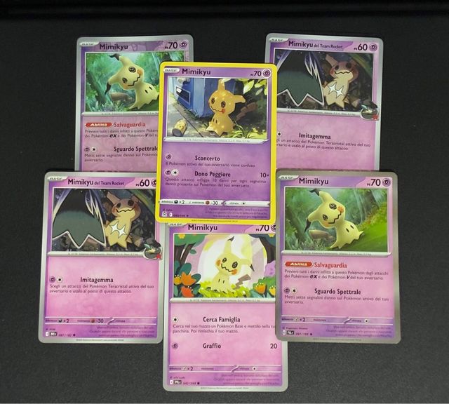 Set di carte Pokemon con protagonista Mimikyu. - Mimikyu (Base) - Mimikyu (Base) - Mimikyu del Team Rocket - Mimikyu (Base) - Mimikyu del Team Rocket - Mimikyu (Base)