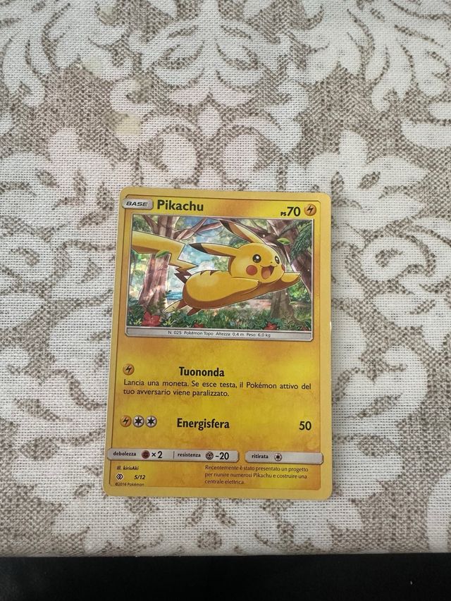 Carta Pokémon Base di Pikachu, numero 025. - Attacco: Tuononda - Attacco: Energisfera - Debolezza: x2 - Resistenza: -20 - Ritirata: 50 - Anno: 2016