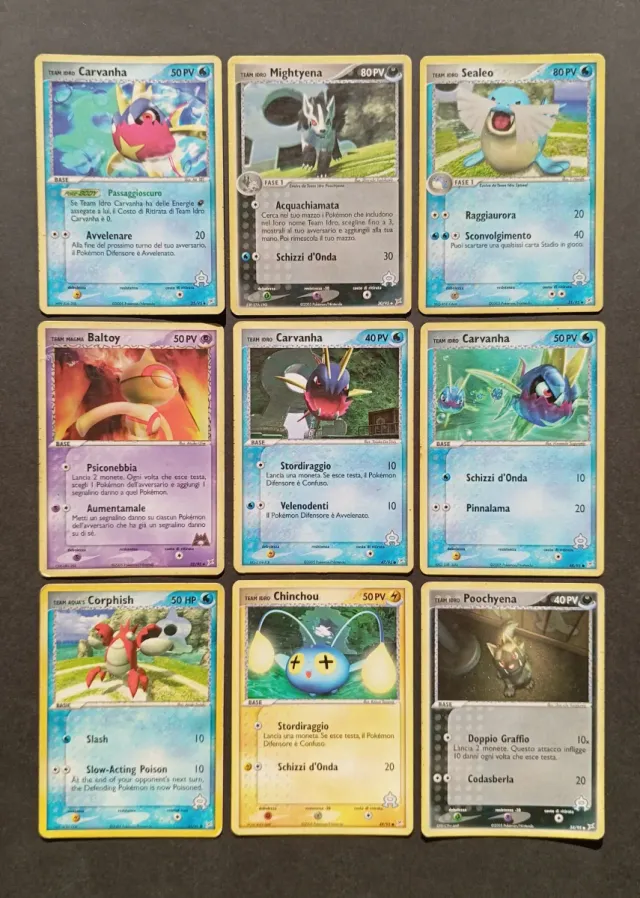 Carte dei Pokémon del set "EX Team Magma vs Team Idro", anno 2005, mediamente in condizioni LP/GD. Imballaggio accurato.