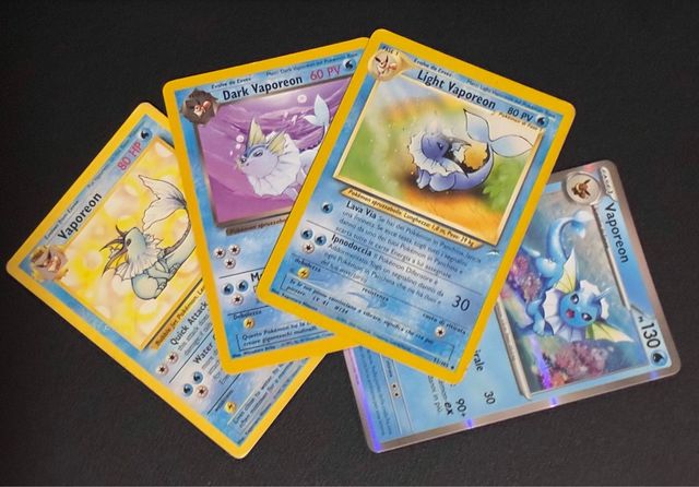Set di 4 carte Pokémon Vaporeon, incluse versioni Dark e Light. - Vaporeon (80 HP) - Dark Vaporeon (60 PV) - Light Vaporeon (80 PV) - Vaporeon (130 PV, olografica)