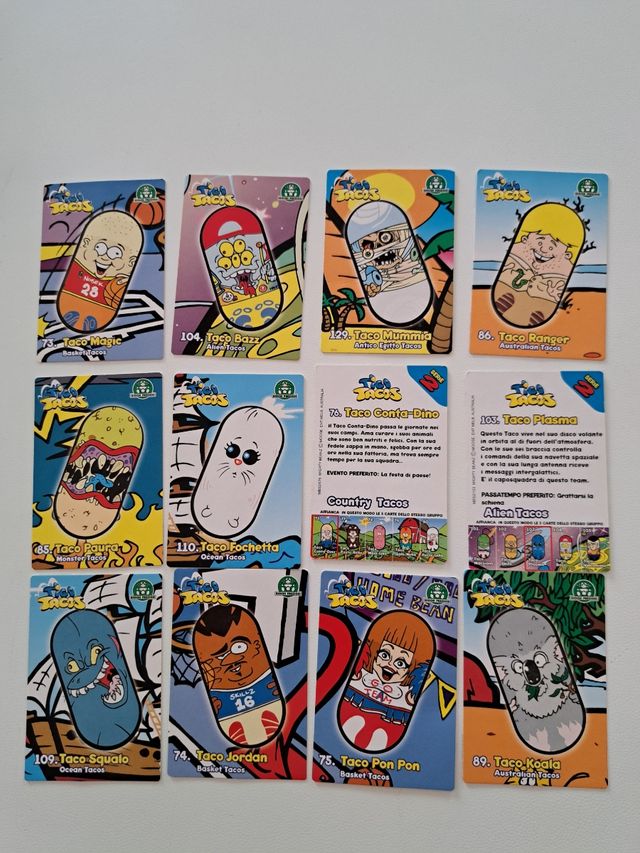 Dettagli del prodottoVendo 12 carte collezionabili Taco, in buone condizioni. Sono tutte diverse e mostrano personaggi divertenti. Perfette per collezionisti o appassionati di carte! - Sono incluse 12 carte. - Le carte sono in buone condizioni.