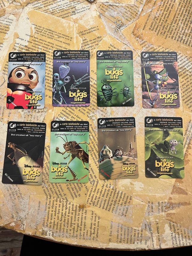Dettagli del prodottoSet di carte telefoniche prepagate a tema A Bug's Life della Disney Pixar.