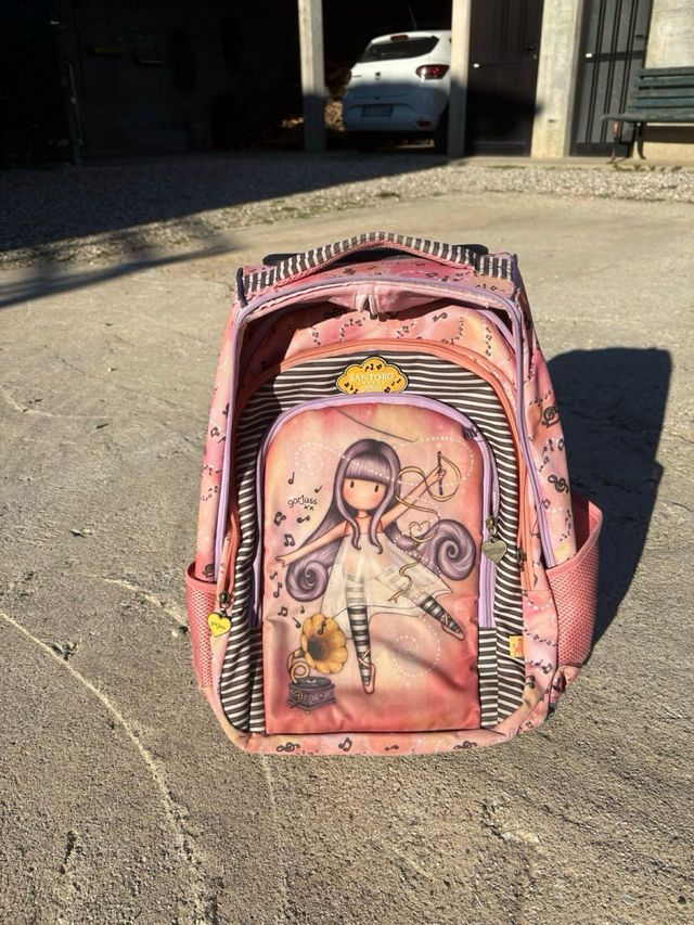 Dettagli del prodottoCartella con rotelle e un simpatico disegno di una bambina con un grammofono.