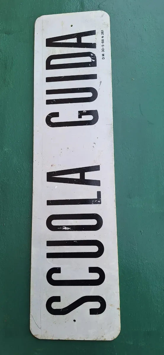 Cartello stradale vintage con la scritta Scuola Guida. - Scritta nera su sfondo bianco. - Plexiglas