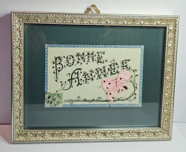 Cartolina d'epoca francese viaggiata con decorazioni in rilievo. - Scritta Bonne Année. - Fiocco in nastro rosa a pois neri. - Cornice decorativa argento