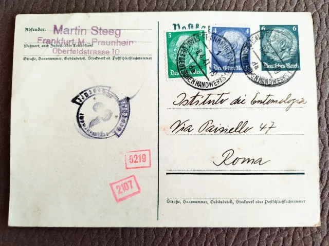 La cartolina presenta francobolli del Deutsches Reich (Impero Tedesco). I francobolli, da 4, 5 e 6 Pfg. Timbri circolari in tedesco confermano l'origine e la data di spedizione, ci sono due timbri con numeri in rosso ("5219" e "2107")