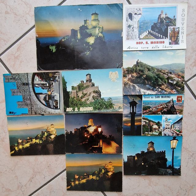 11 postales de San Marino con sellos de los años 60/70 para colección, una de ellas aún virgen con sellos de la edición especial de 1965