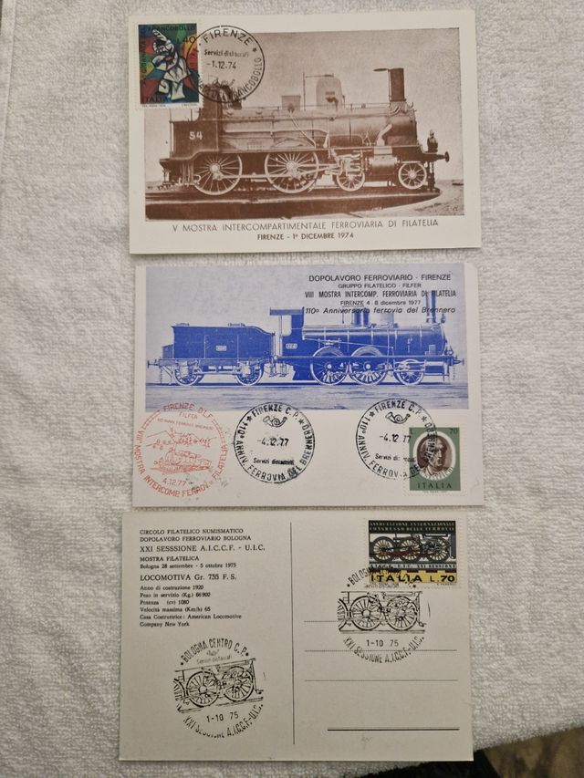 Condizioni ottime, set composto da 3 cartoline serie macchine a vapore con annulli filatelici anni 1974, 1977 e 1975, come da foto.