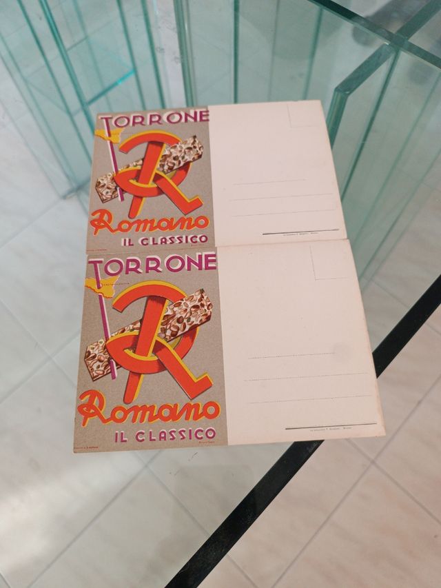 Dettagli del prodottoBellissime cartoline pubblicitarie d'epoca del Torrone Romano, risalenti agli anni '30. Sono due cartoline, in buone condizioni, perfette per collezionisti o amanti del vintage. - Illustrano il classico torrone Romano. - Sono in ottime condizioni per la loro età.