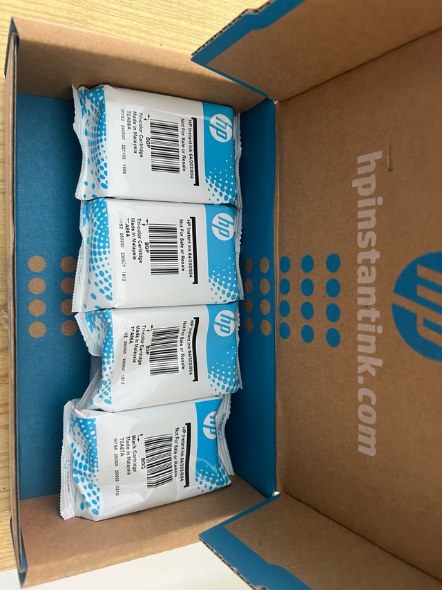 Set di 4 cartucce HP Instant Ink. - 3 cartucce Tricolor. - 1 cartuccia Black. - Codici: 64/303/904, BGP, BOQ. - Made in Malaysia.
